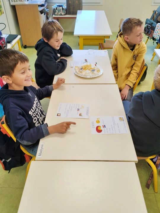 -Dégustation de 4 fromages européens, le camembert de la France, le gouda des Pays-Bas, le parmesan d' Italie et la feta de Grèce (CE1-CE2)