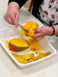 Dans la classe, nous avons appris le nom de certains fruits et légumes apportés par les enfants dont la mangue qui a un gros noyau plat. Les mangues étaient juteuses et délicieuses . Nous avons goûté au concombre kiwano qui a une peau épineuse jaune orangée et une belle chair verte.